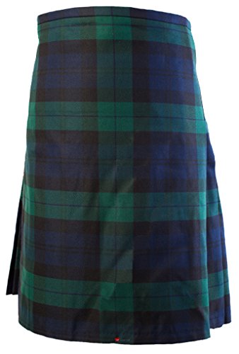 Mens Kilt Black Watch Tartan Full 8 Yard with 24 inch Drop This is a high quality kilt made of 8 yards 16oz heavy weight Poly-Viscose with double fringe on the apron and has extra deep pleats. Each and every pleat at the back is individually sewn to ensure that they stay sharp. The Kilt has three leather straps (2 on 1 side ) that gives the kilt room to expand the waist area as and when required. For example if you are a size 33inch you can loosen out a 32inch to fit. This kilt is ideal for Football Rugby Games Scouts or simply Fashion wear. All our casual kilts come with a regular length of 24inch which can be made shorter by an alterations tailor. Features 8 yard tartan fabric with 24 inch drop 16 ounce poly-viscose woven tartan cloth 100 percent cotton comfort lining Deep back pleats with 2x belt loop hooks 3 Strong leather fastening straps 2 inch over-size strap adjustment This 8 yard poly-viscose kilt has an authentic look and feel making it the perfect budget alternative to our custom made kilts. Kilts are for everyone not just for Scots. When you wear a kilt in any Tartan design at a function or for your wedding or just for fun you are definitely the smartest cookie in the town and the girls just go mad for it. You can add to your kilt by including Kilt hoses belt and buckle along with a Ghillie shirt Gillie Brogues shoes Sock flashesand to finish of the outfit a Sporran. If you want you to further customise your outfit you can add a Prince Charlie or Argyll Jacket Sgian Dubhs and Kilt pin to finish of your outfit. If you need advise and help to put your outfit together please contact us on the main number and we will only be too happy to advise you now and for the future. History The kilt first appeared as the great kilt in the 16th century a full-length garment whose upper half could be worn as a cloak draped over the shoulder or brought up over head as a cloak. The small kilt or walking kilt (similar to the inchmoderninch kilt) did not develop until the l